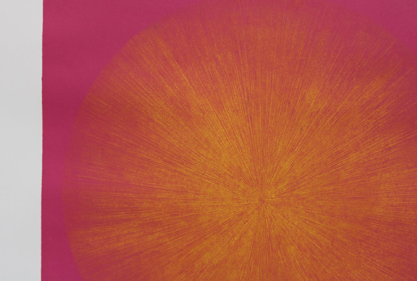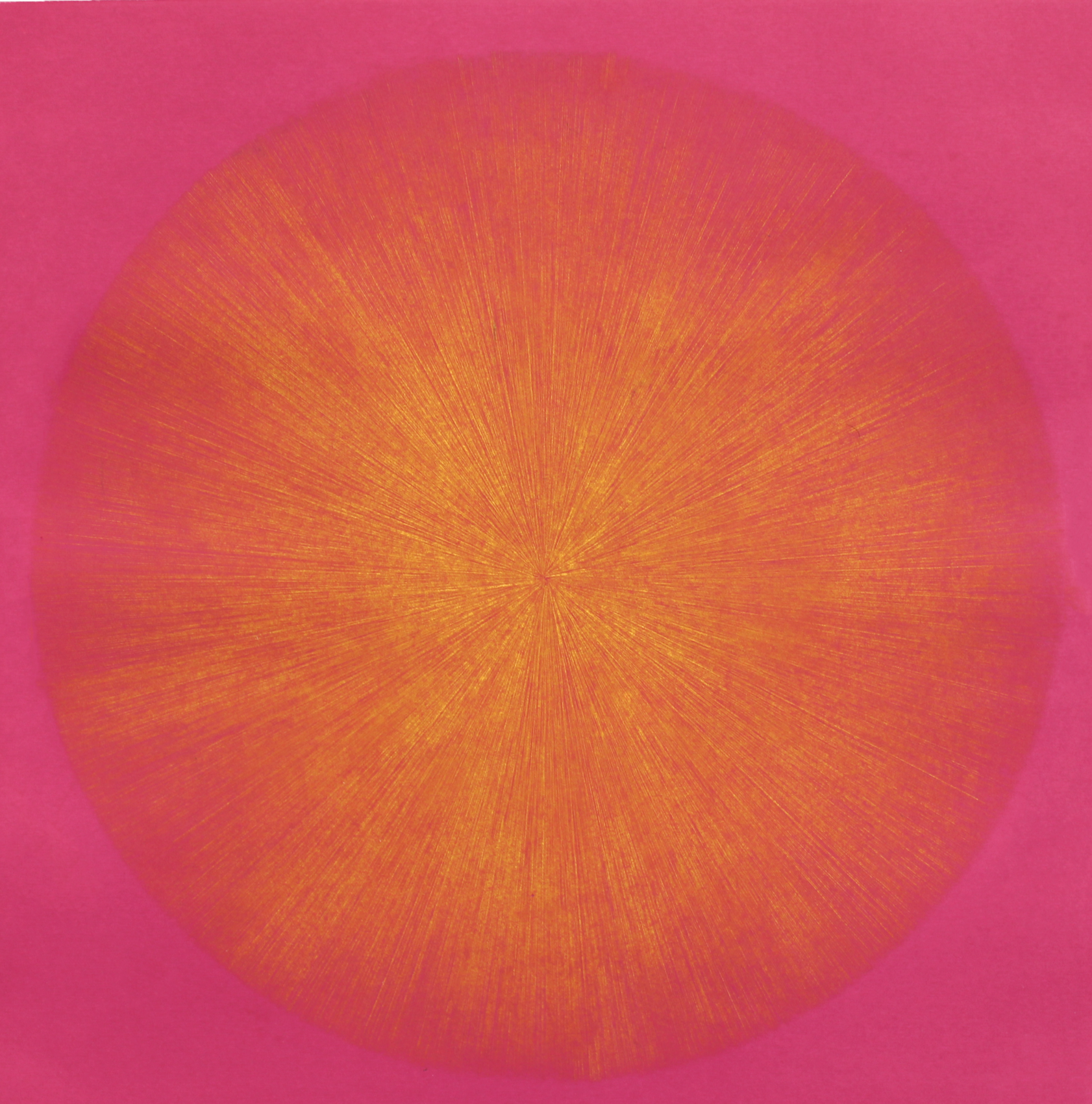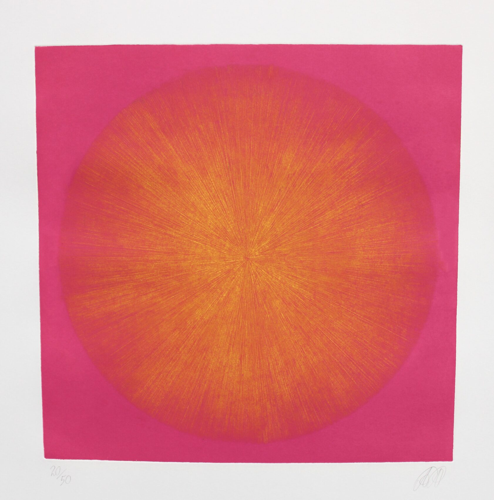 A visually mind-blowing print with thousands of grooves converging towards the centre. The 12 colour combinations come as light against dark and dark on light. A regular square and a precise sphere are combined together, with delicate feathery lines reflecting the perfection of nature and its beauty. As some grooves are more closely knit together they create some bolder colour strands within the circle, lending a natural feel to this precise work. Engraving is an extremely time consuming process which makes this work so rare and special. The series can be displayed as a stunning nine block colour group, but also as a quartet, triptych or single entity!